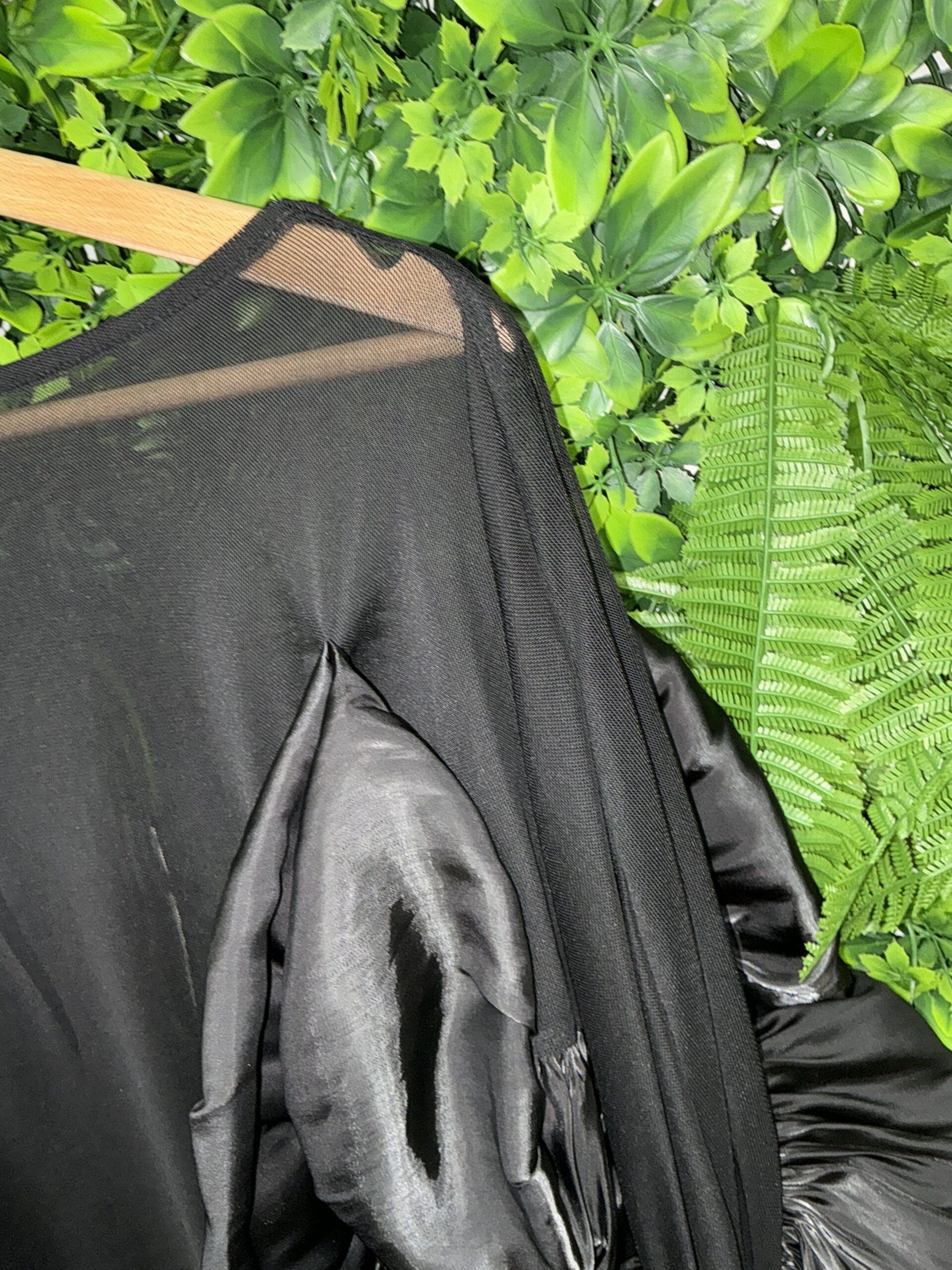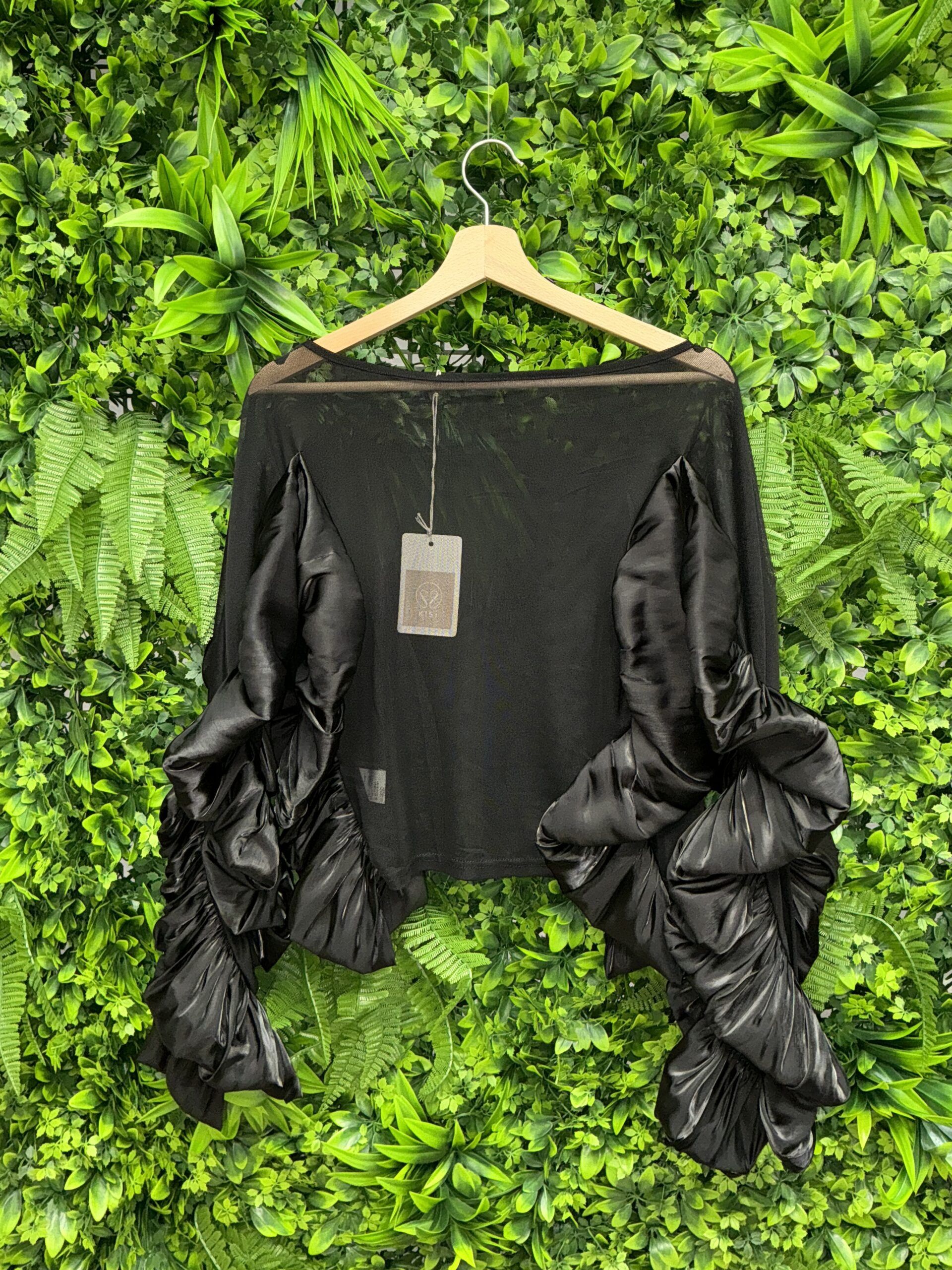 Camicia nera elegante in poliestere ed elastan, ideale per l’autunno, con maniche lunghe speciali e collo a barca.