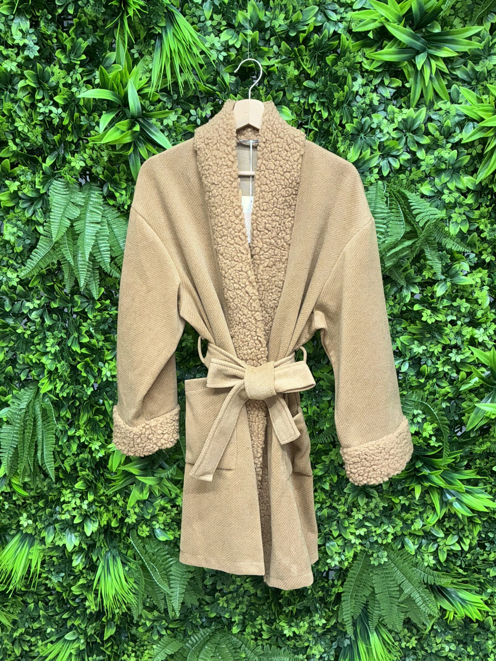 Cappotto elegante in poliestere 100%, con cintura e tasche, perfetto per l’autunno/inverno. Caldo e confortevole
