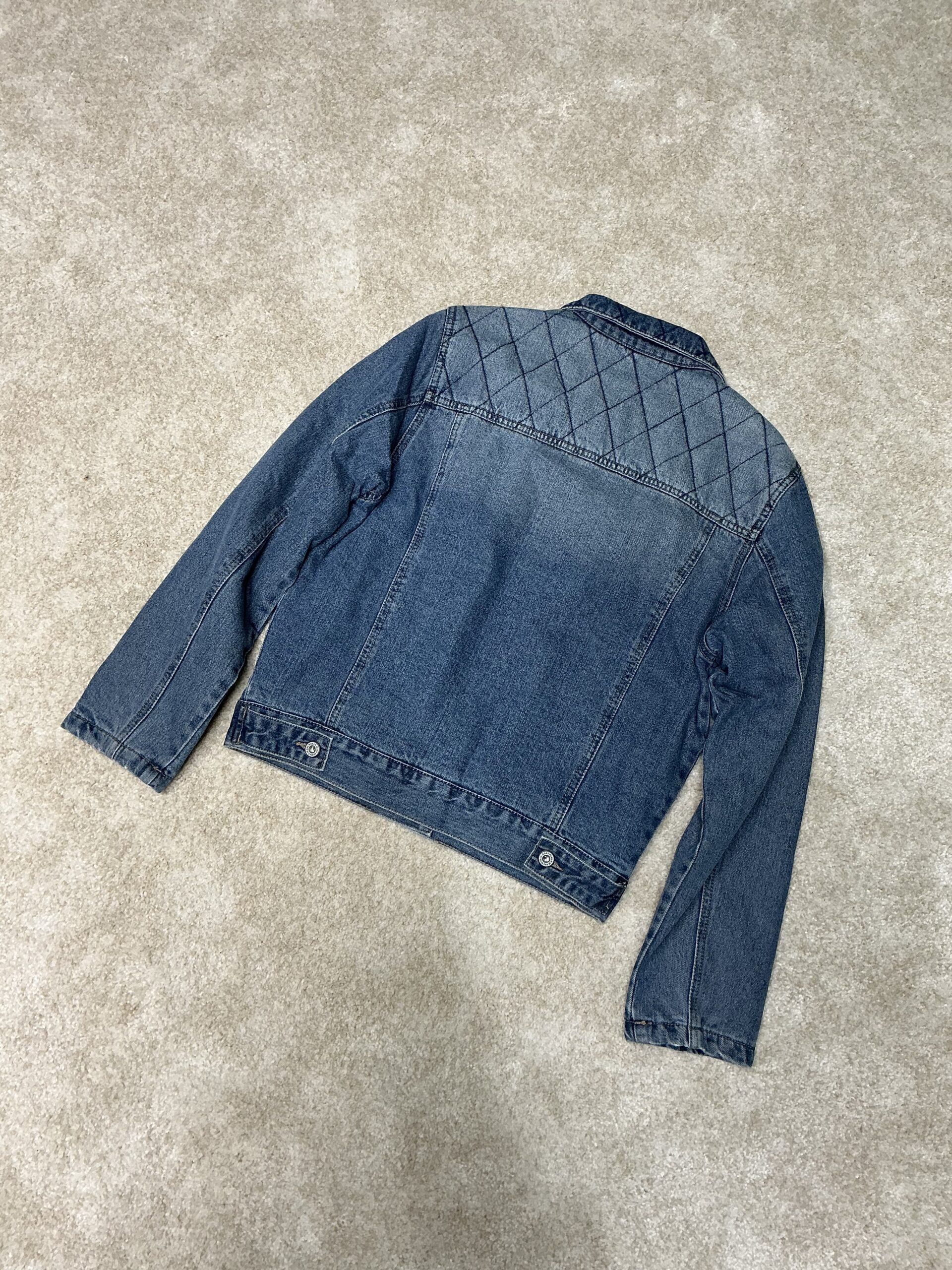Giacca colore jeans elegante con brillanti sul davanti tasche e bottoni davanti manica lunga elegante