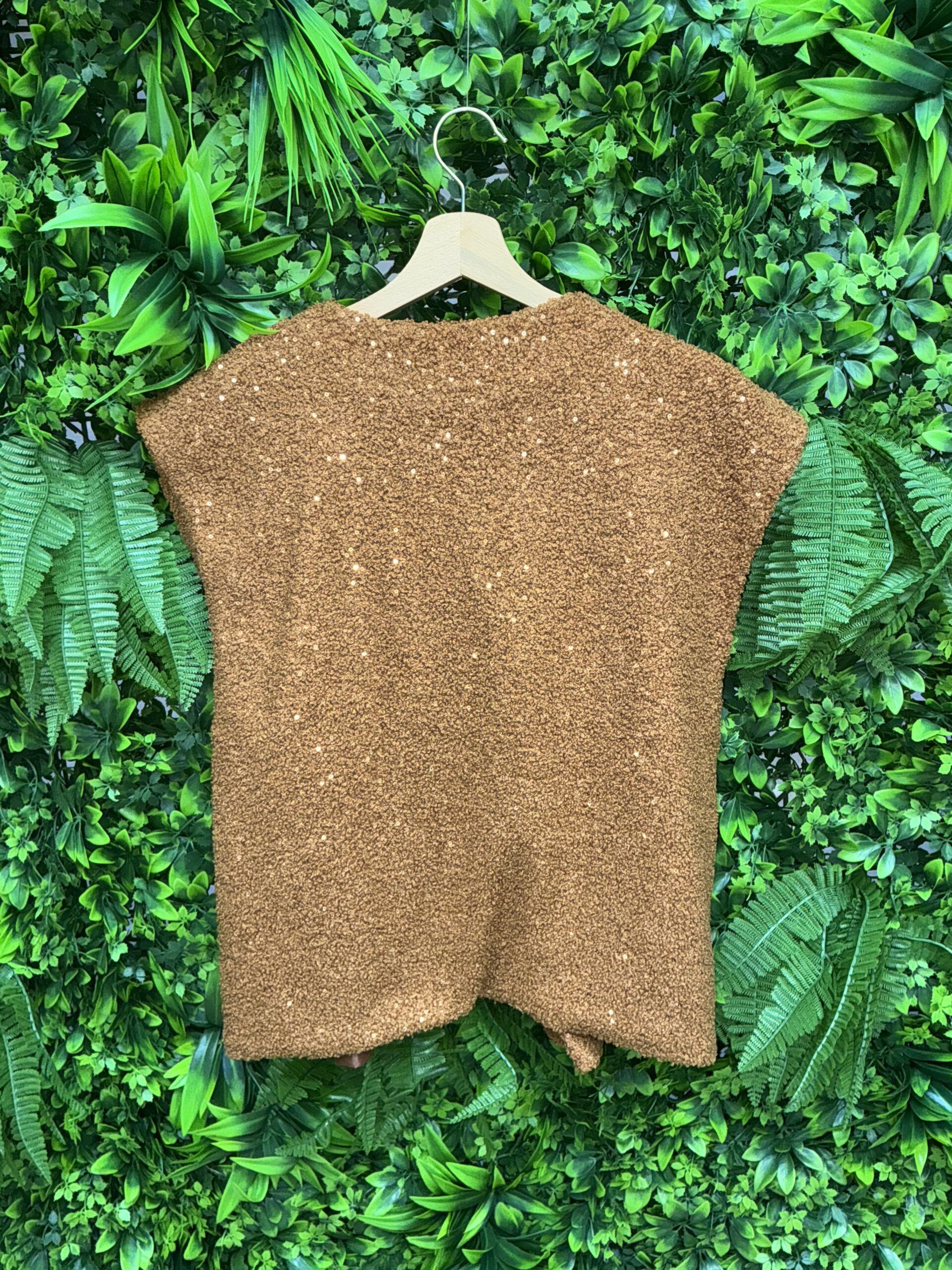 Giacca smanicato donna in poliestere, elegante con brillanti, apertura frontale e due tasche, ideale per l’autunno/inverno.