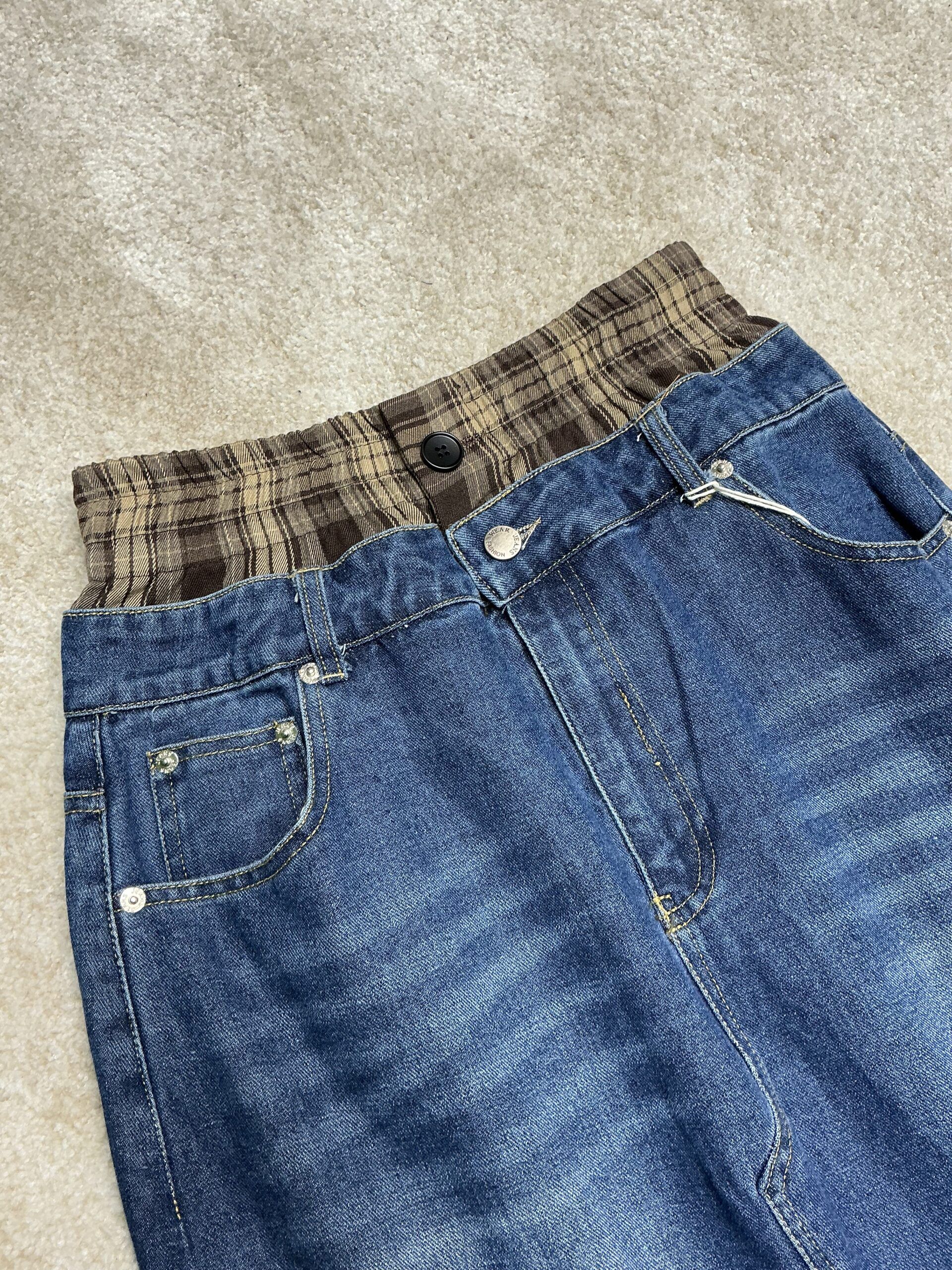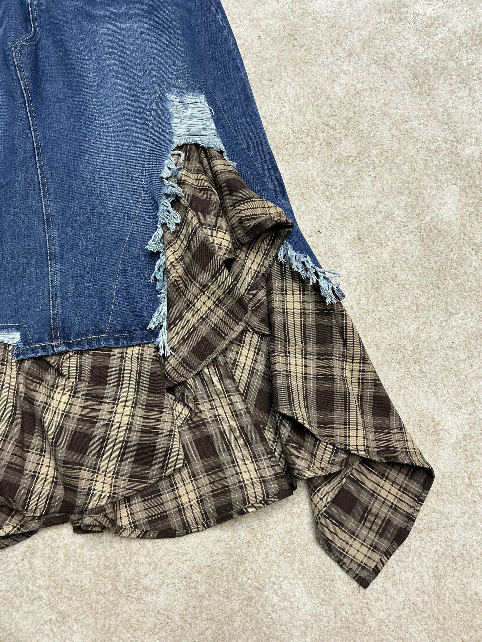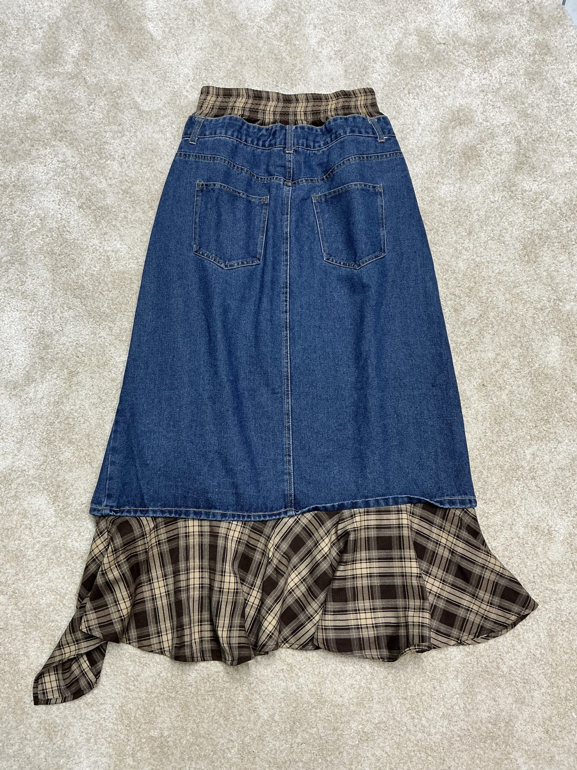 Gonna di jeans alta qualità, 72% cotone, ideale per primavera/estate, stampa a quadri, bottoni frontali, prodotta in Cina.