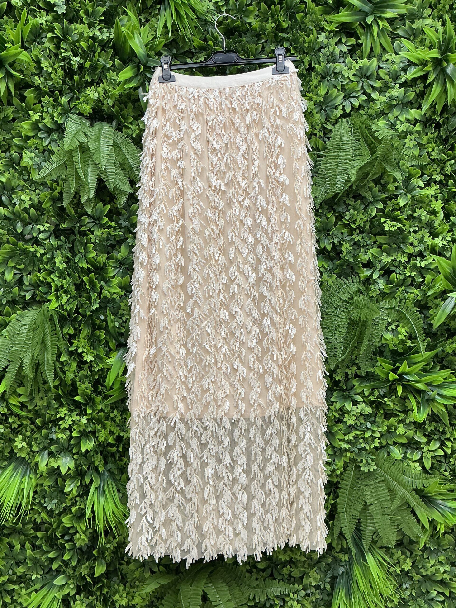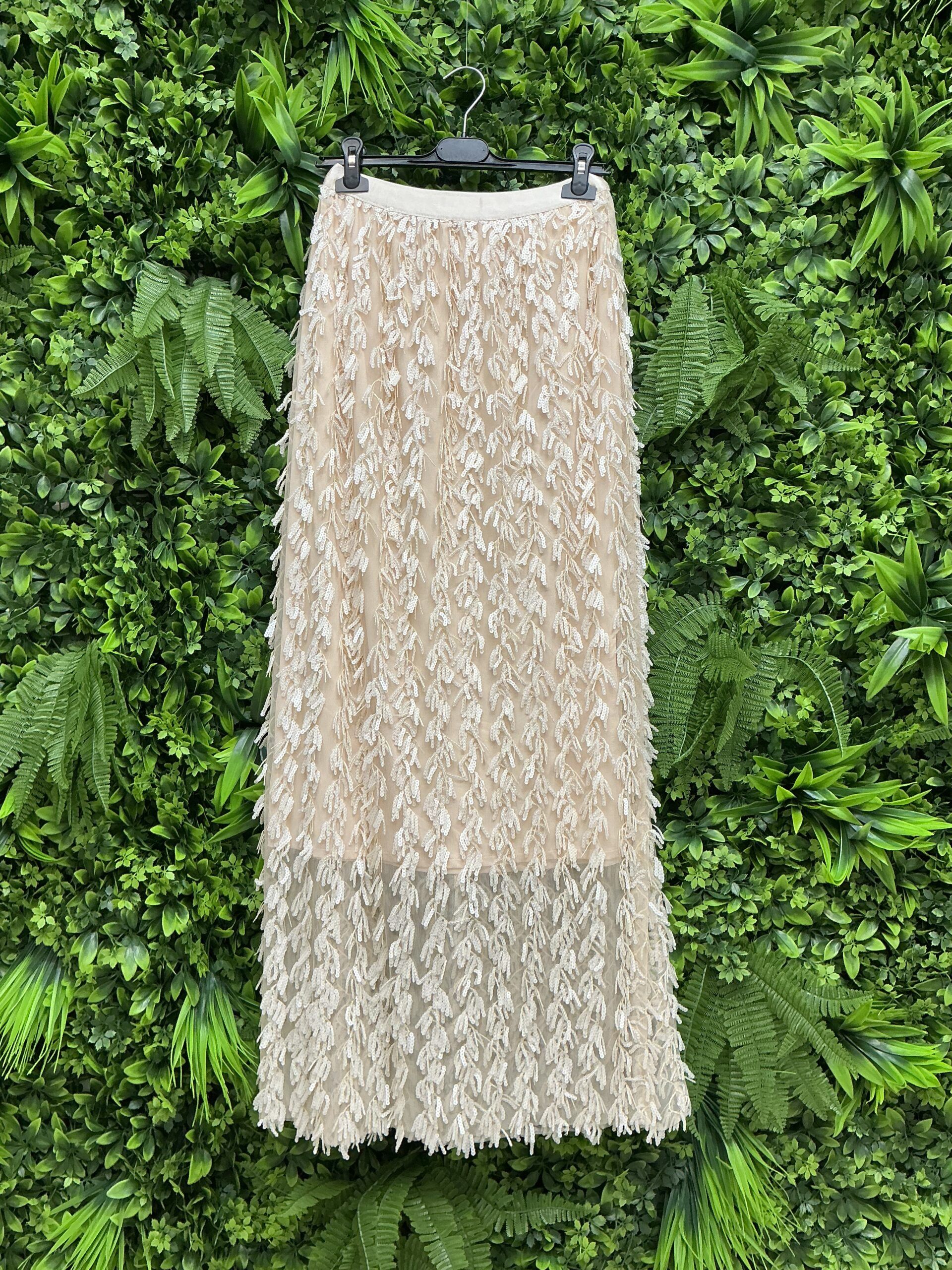 Gonna elegante in poliestere, vita alta con paillettes scintillanti, perfetta per le feste primaverili. Prodotto in Cina per la collezione Primavera/Estate