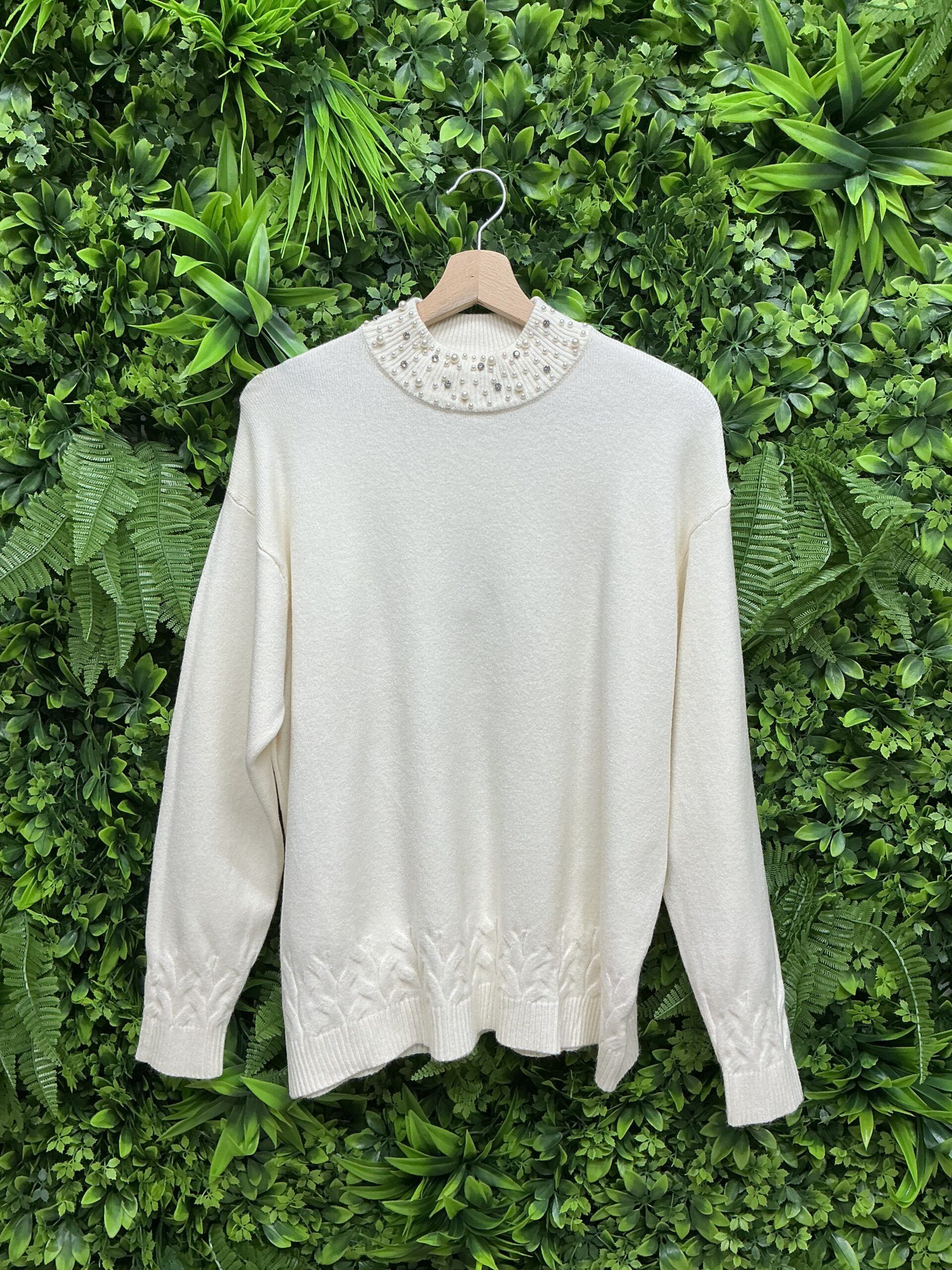 Maglia elegante da donna manica lunga girocollo con perline sul collo tinta unita taglia unica