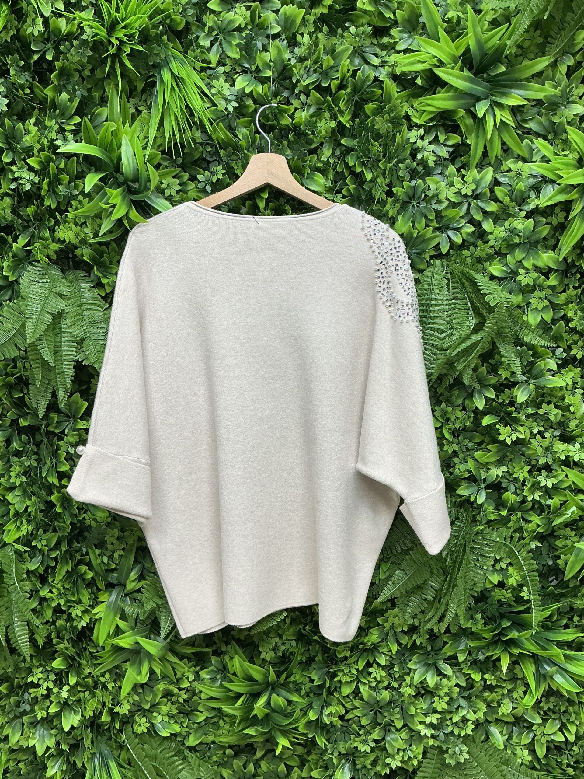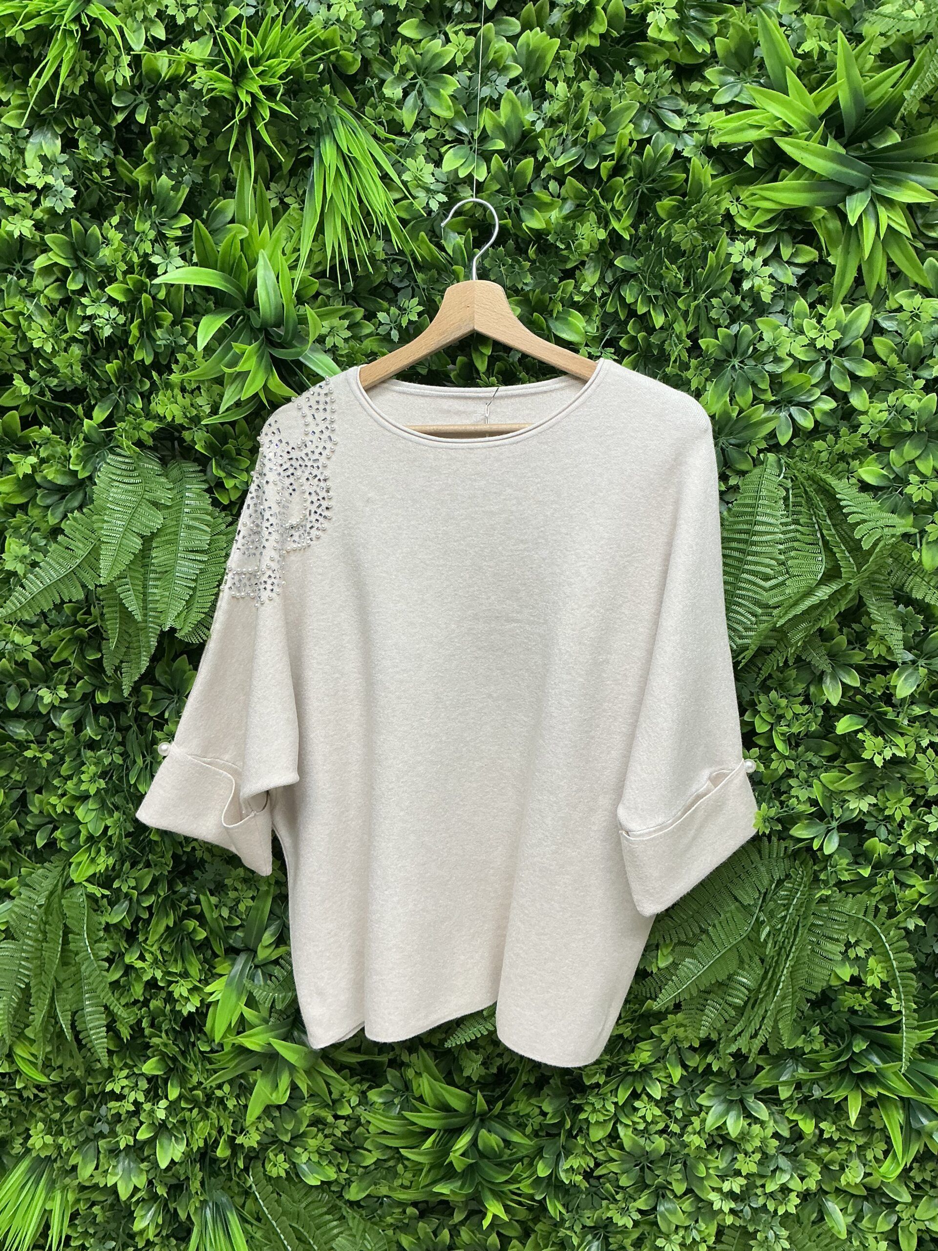 Maglia da donna elegante meta manica a girocollo con perline sulla spalla tinta unita