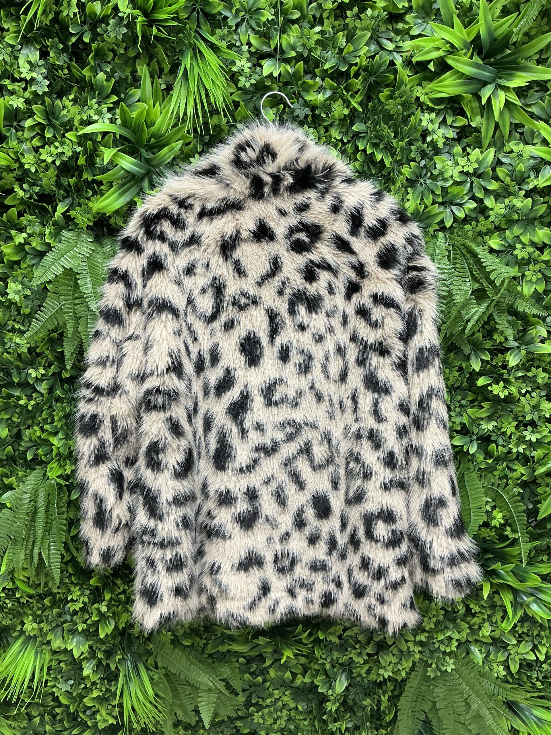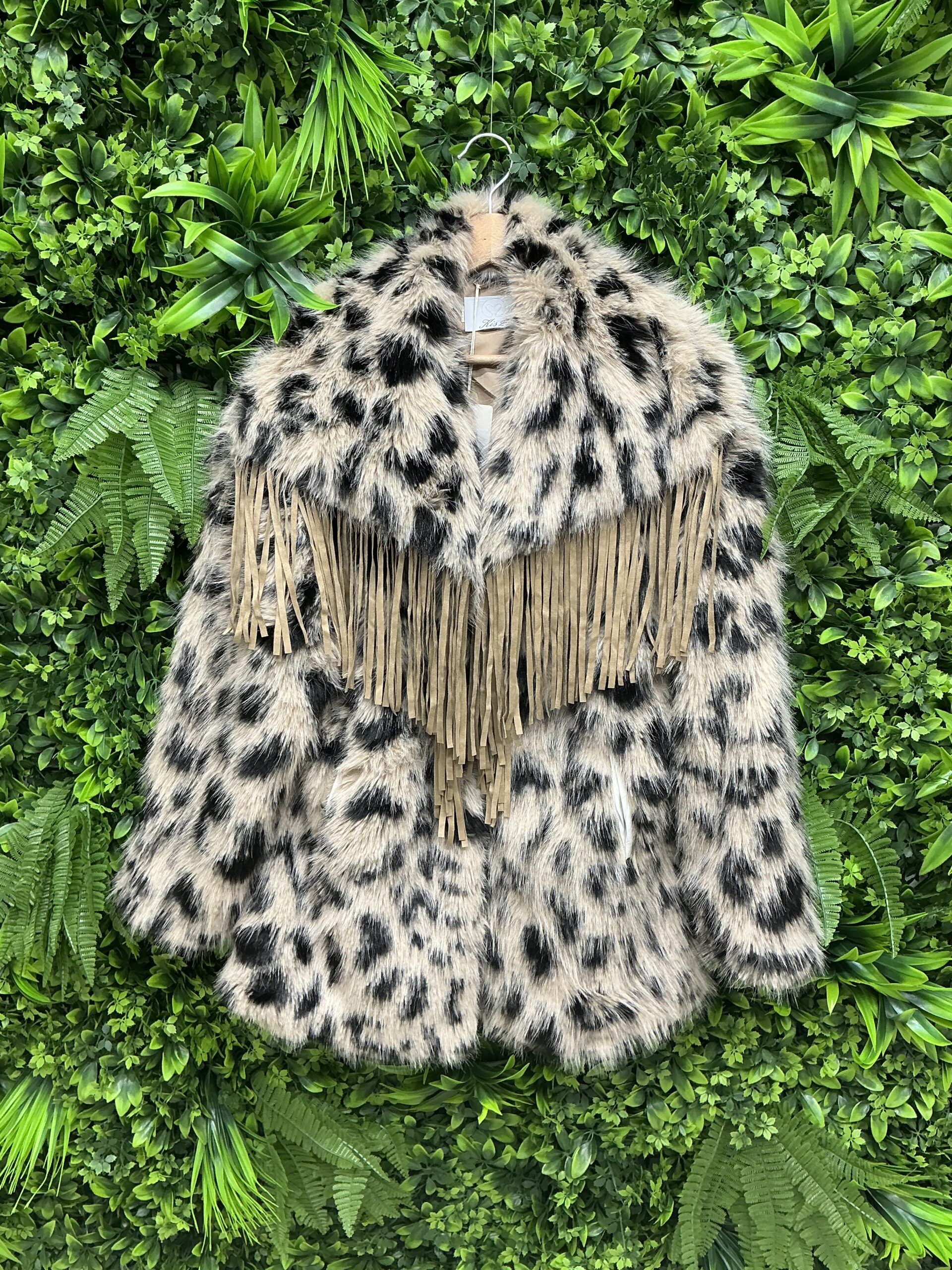 Cappotto autunnale in poliestere 100%, stampa leopardata, design con frange avanti e dietro, prodotto in Cina per l’inverno 2025/2026